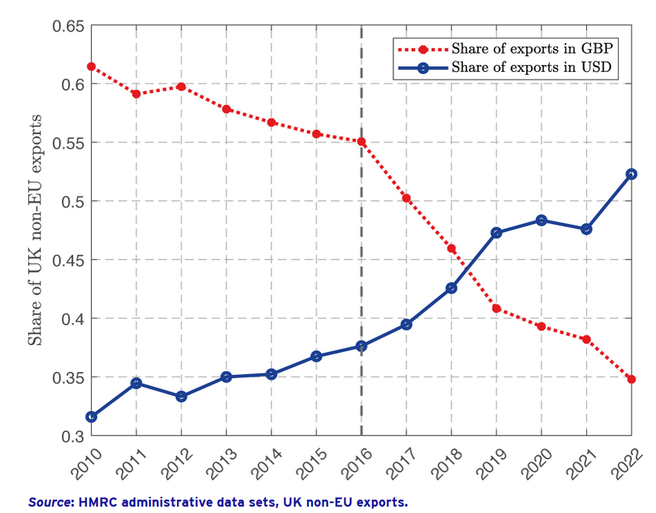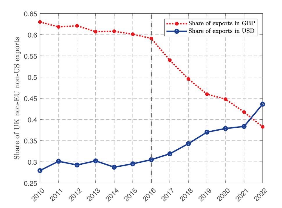 Most international trade is denominated in dominant currencies (Gopinath and Itskhoki 2021) such as the US dollar. What explains the adoption of dominant currency pricing and what are its macroeconomic implications? In a recent paper (Garofalo et al. 2024), we explore a rare instance of transition in aggregate export invoicing patterns. In the aftermath of the depreciation that followed the Brexit referendum in 2016, UK exporters progressively shifted to invoicing most of their exports in dollars, rather than in pounds. This was driven by firms more exposed to currency mismatches – for example, exporting in pounds but importing in dollars before the depreciation. As a result of this aggregate transition to dollar pricing, a dollar appreciation now depresses demand for UK exports by twice as much than before 2016.