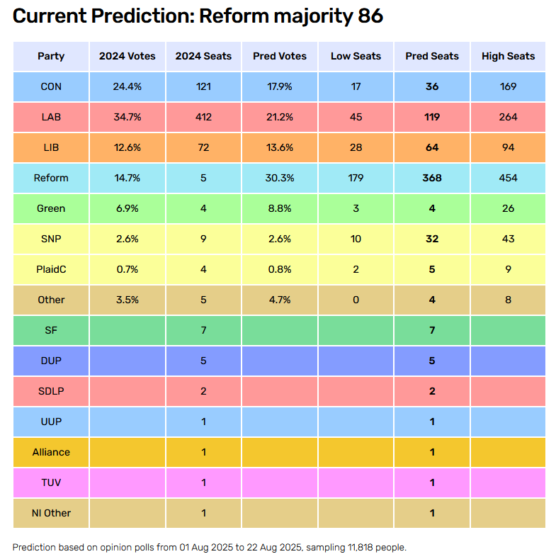 Electoral Calculus: end-Aug General election prediction: Reform majority of 86 seats
