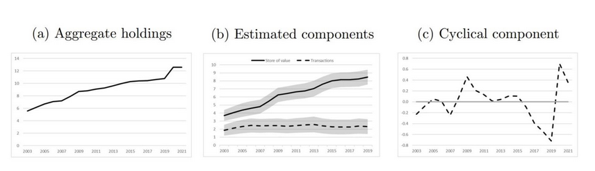 Figure 1 illustrates some of these empirical observations for the case of the euro area. Panel (a) reports euro-denominated aggregate cash holdings as a per cent of GDP at the annual frequency and for the period 2003-2021. Cash holdings have been increasing over the entire horizon. Panel (b) displays the estimated component of total cash holdings used for transaction purposes (dashed line) and that used as a store of value (solid line). The steady increase in aggregate cash holdings over time is to be mainly attributed to the patterns of the estimated cash holdings as a store of value. Panel (c) plots the cyclical component of euro-denominated aggregate cash holdings.