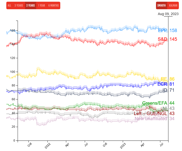 If the elections were held today, the right-wing European Conservatives and Reformists (ECR) would become the third-biggest group in the European Parliament — tied with the centrist Renew — with 89 seats.