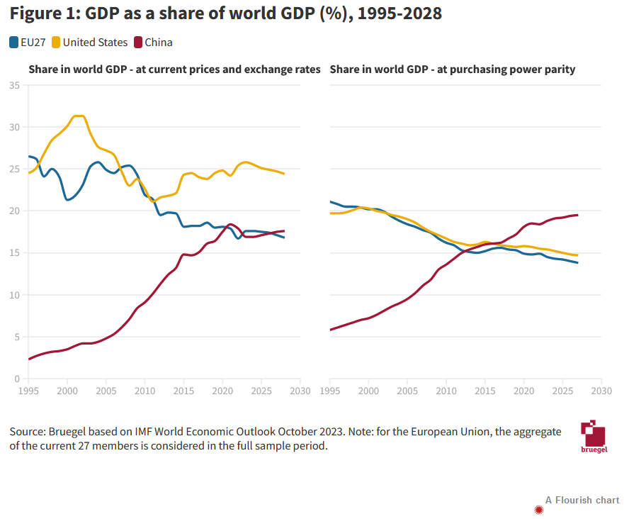 The right metric for international comparisons is purchasing power parity (PPP)-adjusted output. This corrects for exchange rate fluctuations and differences in various national prices. Figure 1 shows both indicators by plotting the EU, US and for comparison Chinese shares of world GDP. There is considerable variation in the EU and US shares at current prices and exchange rates (left panel of Figure 1). But measured at purchasing power parity (right panel of Figure 1), the shares of the two economic giants can be seen to be declining tandem. The EU is losing slightly more, but the gap with the US is not dramatic: the EU27 and the US had the same PPP-adjusted output in 2000, while in 2022, the EU27 economy was 4 percent smaller. The International Monetary Fund (IMF, 2023) forecast that the EU27 economy will be 6 percent smaller than the US economy in 2028.